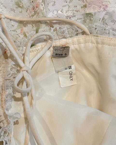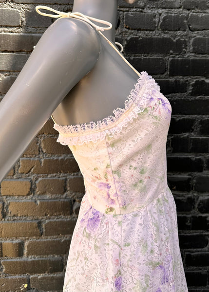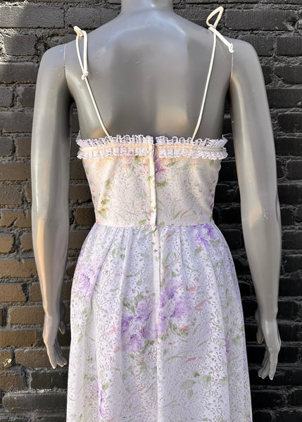 Now this is a showstopper! A delicate floral pattern printed on lace, with lovely ruffles at the neckline and mid skirt. She is designed to touch the floor with a skirt length of 43” after the empire waist! No brand or fiber content tag, but a little digging proves this to be a mid ‘70s piece by Helen Joy.