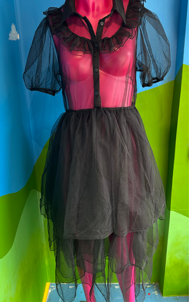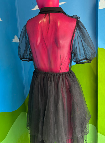 This dress was designed fashion forward with ruffled collar detail, cuffed sleeves, and four layers of sheer skirts creating a puffy shape that would be perfect for layering or as a standalone piece! 💫