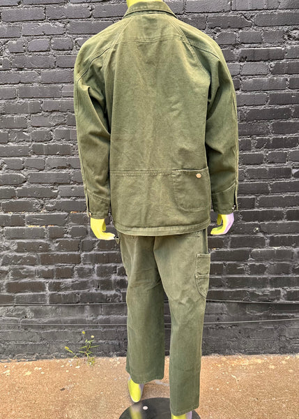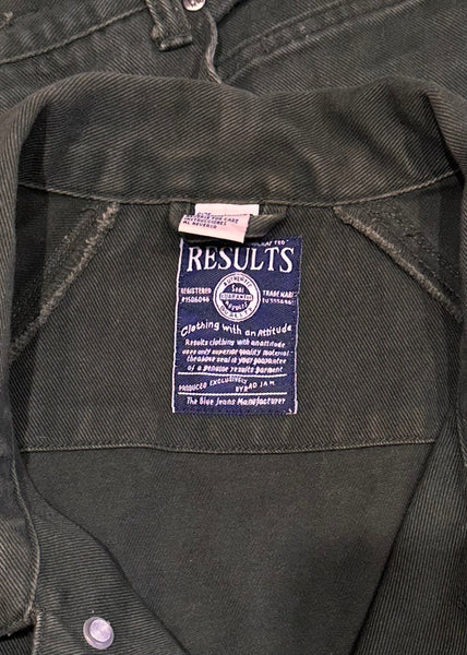 The perfect ‘90s street wear! Incredible forest green denim, made by Results by Rad Jam. Both the pants and jacket are full of details: tons of monogrammed buttons and grommets, hammer loops on jacket and jeans, and a total of 14 pockets!