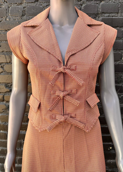 Such a cute ‘50s style set! The burgundy and tan colors are just perfect for fall. There are hook and eye closures at every tie, so you don’t have to worry. Add in the a-line skirt, and the overall shape is so flattering!