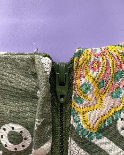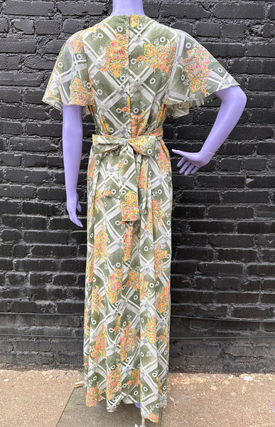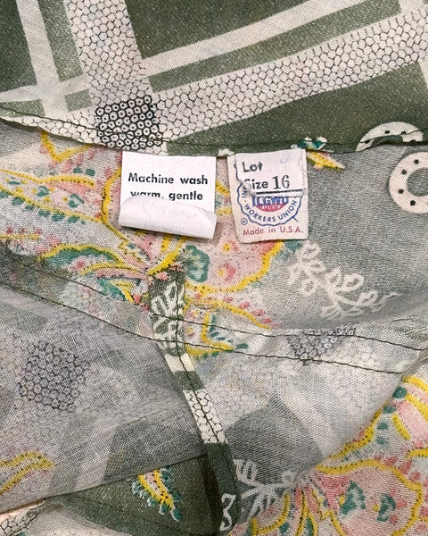 A ‘70s does the ‘40s dream! She’s got color, pattern, and a beautiful cut. Fabric is semi sheer, and will float on even a slight breeze. Plus a waist determined by a tie makes for easy adjustments.