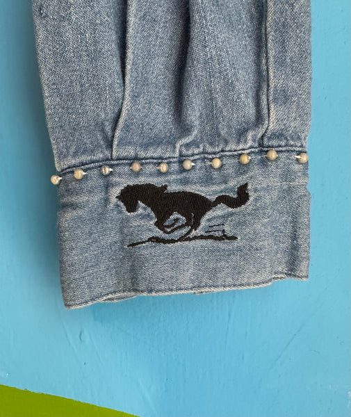 This unique vintage piece features rodeo embroidery and silver stud accessories along the collar and cuffs ~ a vintage denim lovers dream ๐