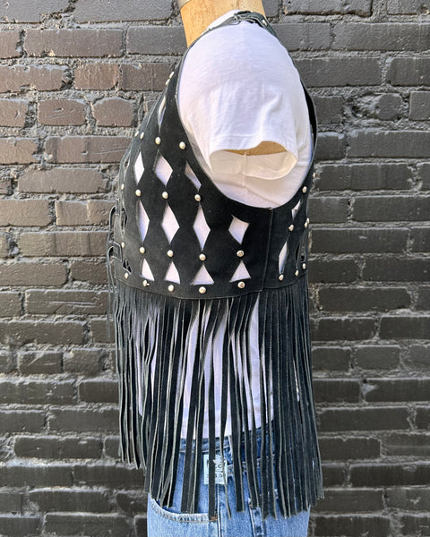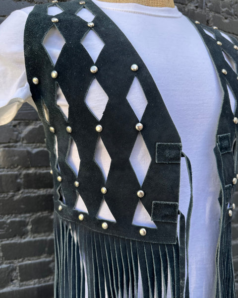 This is a spectacular wester wear piece. Thick, heavy suede and 12 inch fringe! So many cool details, like the cross ties on the shoulders and ties in the front.