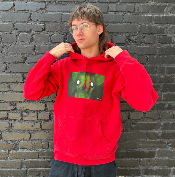 A Supreme stunner! Nice heavyweight cotton hoodie, and a great graphic. Made in Canada. Light general wear/fading, but no major stains or damage.