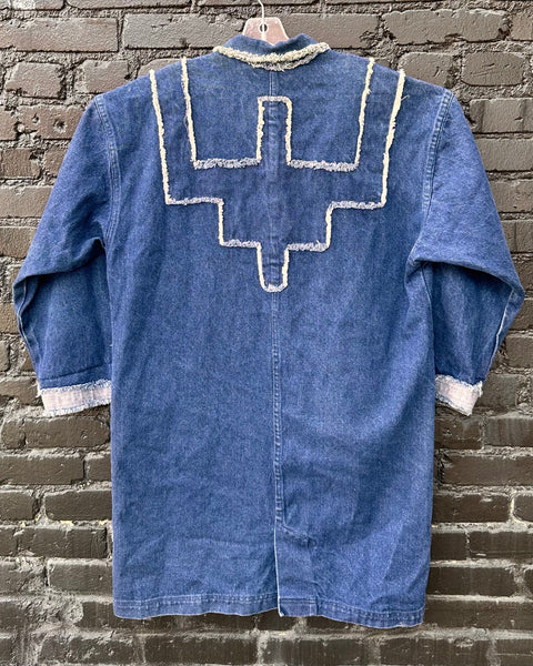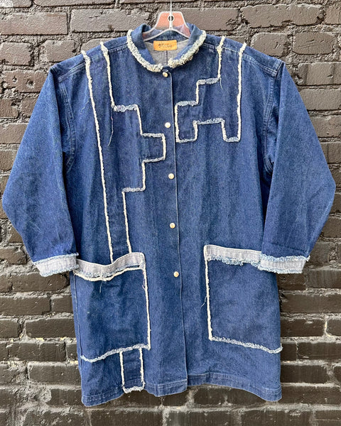 The perfect head turner! Great silhouette, and so many added details. Raw edge embellishment throughout, especially on collar, sleeve cuffs, and perfectly oversized pockets. Made in the USA, 100% cotton. In great vintage condition, no visible wear or stains.